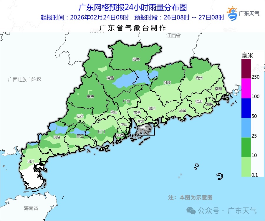 26—28日,广东自北向南有一次中到大雨局部暴雨的降水过程,并伴有雷电,部分市县有20~40毫米的短时强降水。