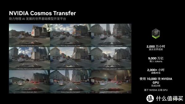 第三个仿真,它可以把一些路采的数据、测试的数据极大地去增强。你可以在路上放一些东西,看车怎么反应,而且那个都是基于现实场景都不是造的,你可以去改你的真实世界。现在不管车怎么开,你都可以把周围的世界像素级还原出来。另外,你可以通过 Cosmos 去造一些类似的东西,或者是去更改它的环境、天气。这样就可以把你数据的丰富量给极大地增强。