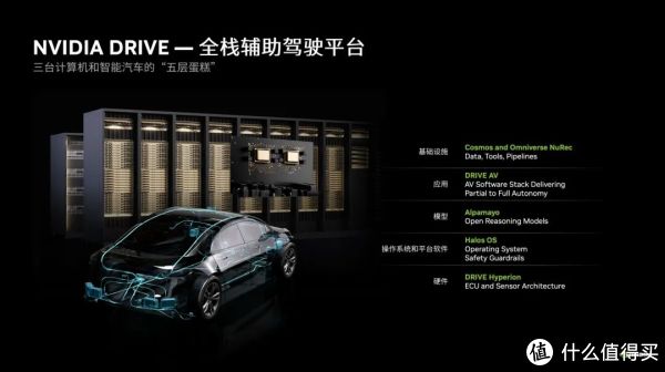 第四层是应用层,DRIVE AV 是自动驾驶软件栈,负责将模型能力转化为实际的驾驶行为,包括感知、定位、决策与控制。它既可以运行传统模块化算法,也可以承载端到端 AI 模型。